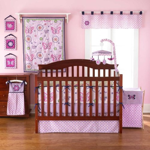 - The Flutter 5 Piece Baby Crib Bedding Set includes reversible comforter, reversible 4-piece bumper, dust ruffle, fitted sheet and diaper stacker